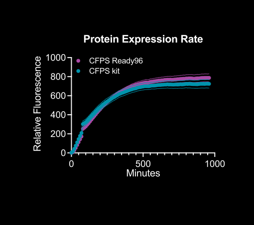 Ginkgo's CFPS Ready96 kit has the same performance as the CFPS kit, but comes pre-aliquotted to minimize reaction setup time.